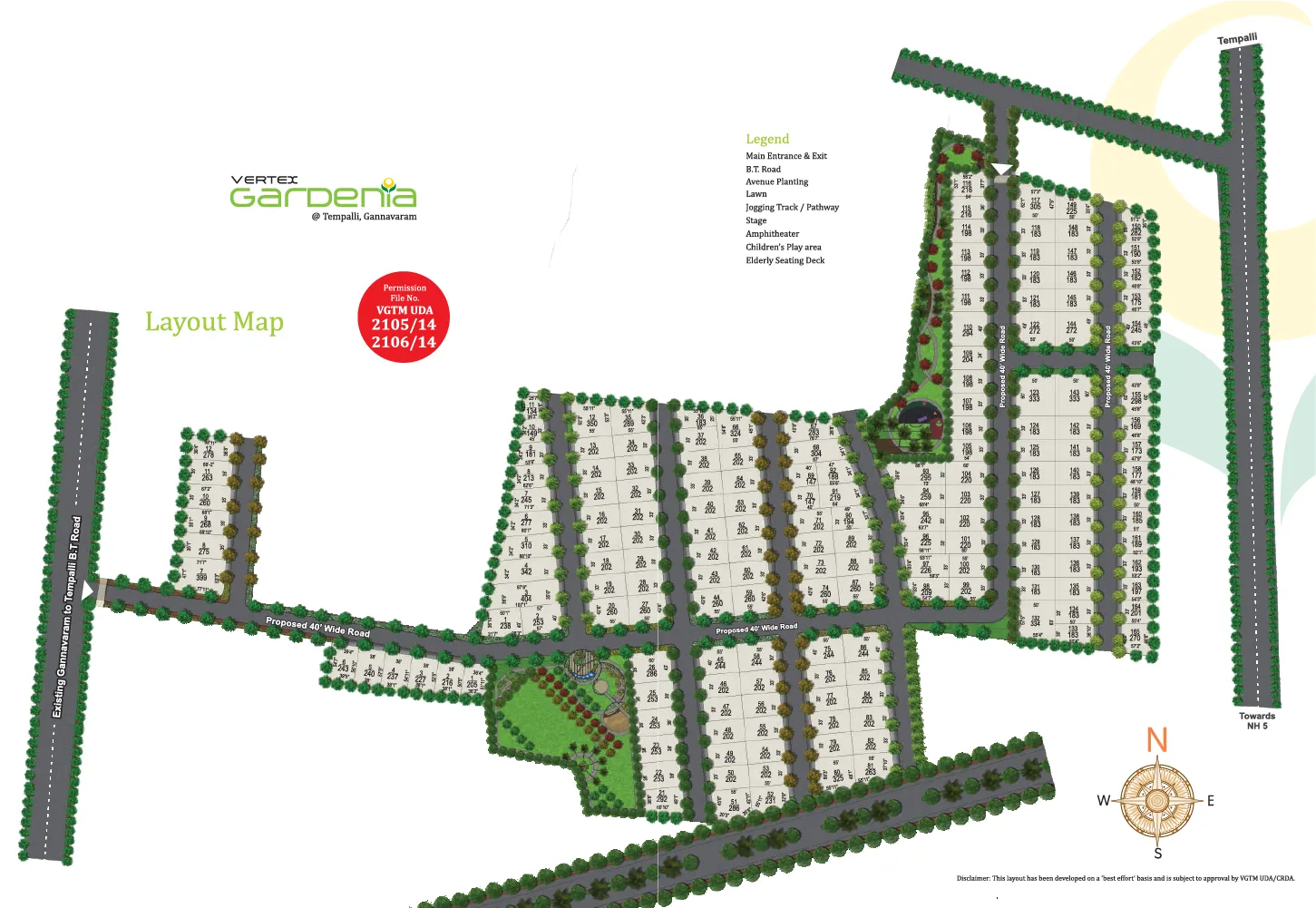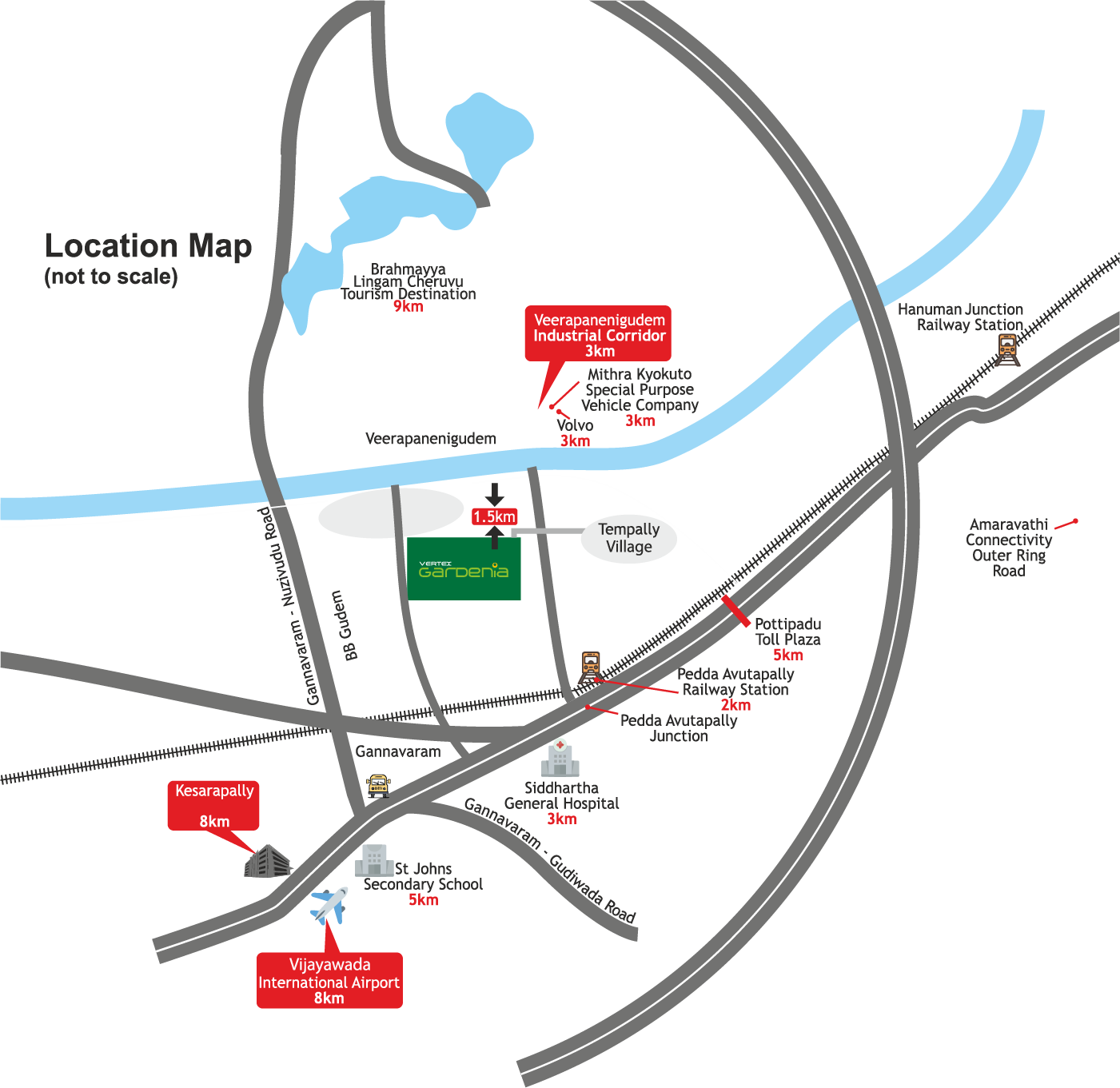Vertex Gardenia offers premium open plots in the peaceful locality of Gannavaram, near Vijayawada International Airport, close to the capital Amaravati. Secured with a compound wall featuring solar fencing and 24-hour surveillance, Gardenia is conveniently situated near Pedaavutapalli Railway Station. With parks and a children's play area amidst lush avenue plantations, it is one of the most serene locations to reside in.